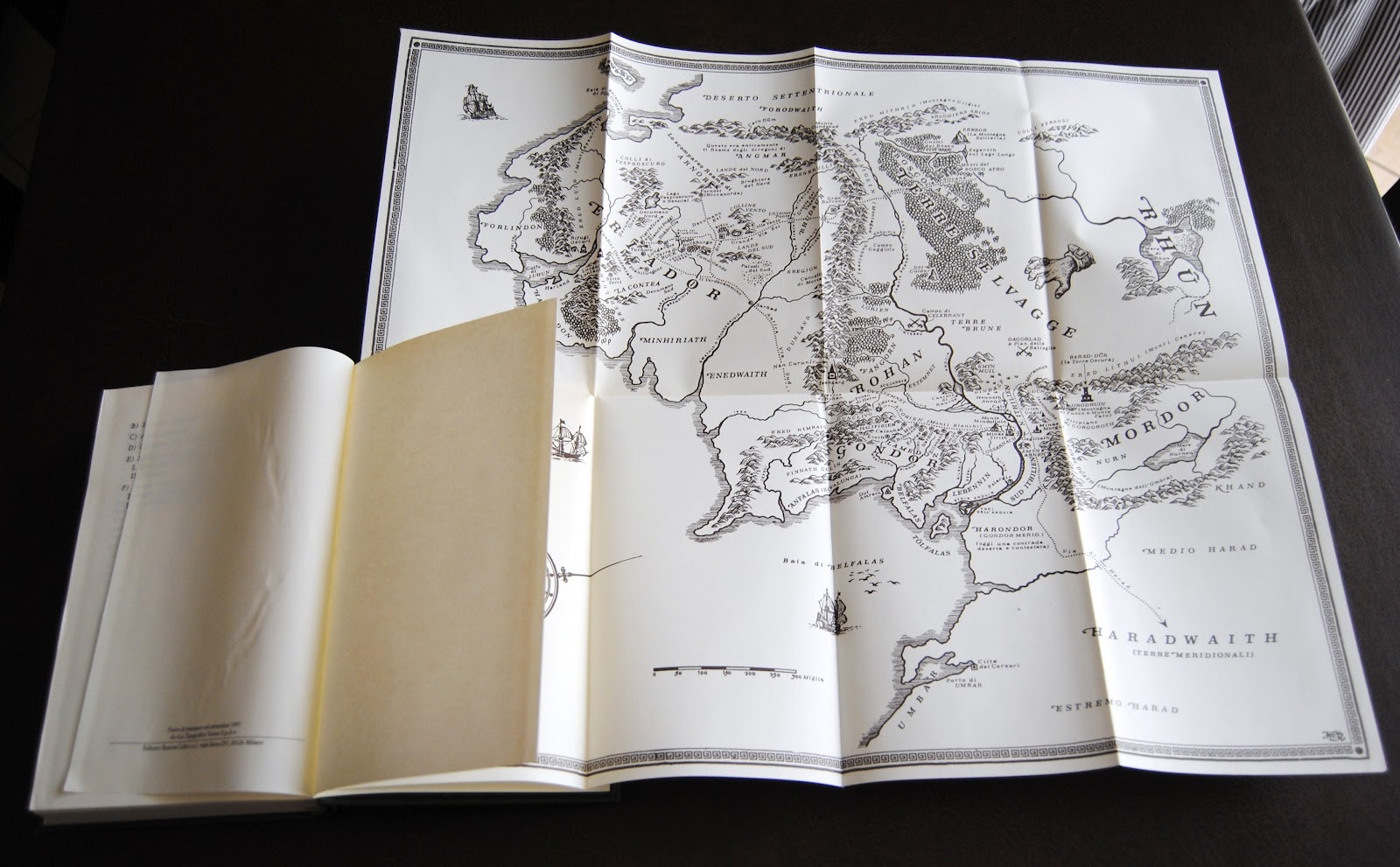 Scheda del libro del “signore degli anelli”. Una carta ripiegata stampata in nero della terra.