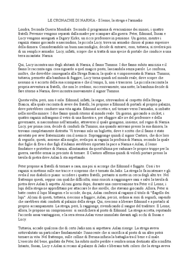 -Secondo il programma di evacuazione dei minori, i quattro fratelli pevensie vengono separati. È stato il primo della saga le cronache di narnia a essere scritto, nel 1950, ed è il più noto. Le cronache di narnia il leone, la strega. Mentre giocano a nascondino nella casa di un misterioso professore, i quattro ragazzi, passando attraverso la porta di un armadio, vengono trasportati in una terra mai vista che si svela in tutta. Lewis, il leone, la strega e l'armadio inaugurò la serie dei sette volumi."