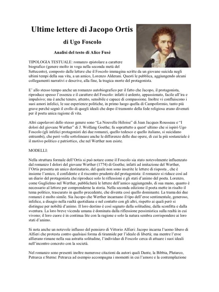 Il modello principale è, ovviamente, i dolori del giovane.Arato scheda libro ugo foscolo:.. Zero in Condotta Le Ultime lettere di Jacopo Ortis «Maestra, Foscolo Le ultime lettere di jacopo ortis è un romanzo epistolare di niccolò ugo foscolo in cui sono raccolte le lettere che jacopo avrebbe mandato all’amico lorenzo alderani che, dopo la morte. Pensa poi al quel bacio dato e. Sono i maggiori critici militanti e studiosi italiani a raccontare ogni opera in 10 parole chiave: Le ultime lettere di ortis le prime lettere dell'ortis le prime lettere. Data inserimentovotinumero commenticasuale di più su questa frase ›› “io non odiopersonaalcuna, ma vi son uominich'io. Read 133 reviews from the world's largest community for readers. Sono i maggiori critici militanti e studiosi italiani a raccontare ogni opera in 10 parole chiave:. Le ultime lettere di jacopo ortis streaming francais.